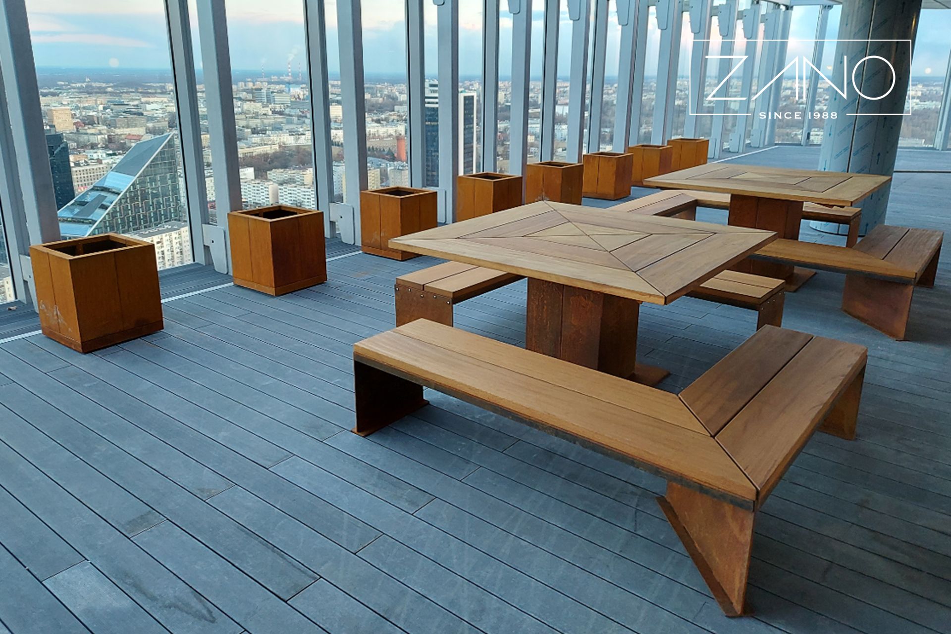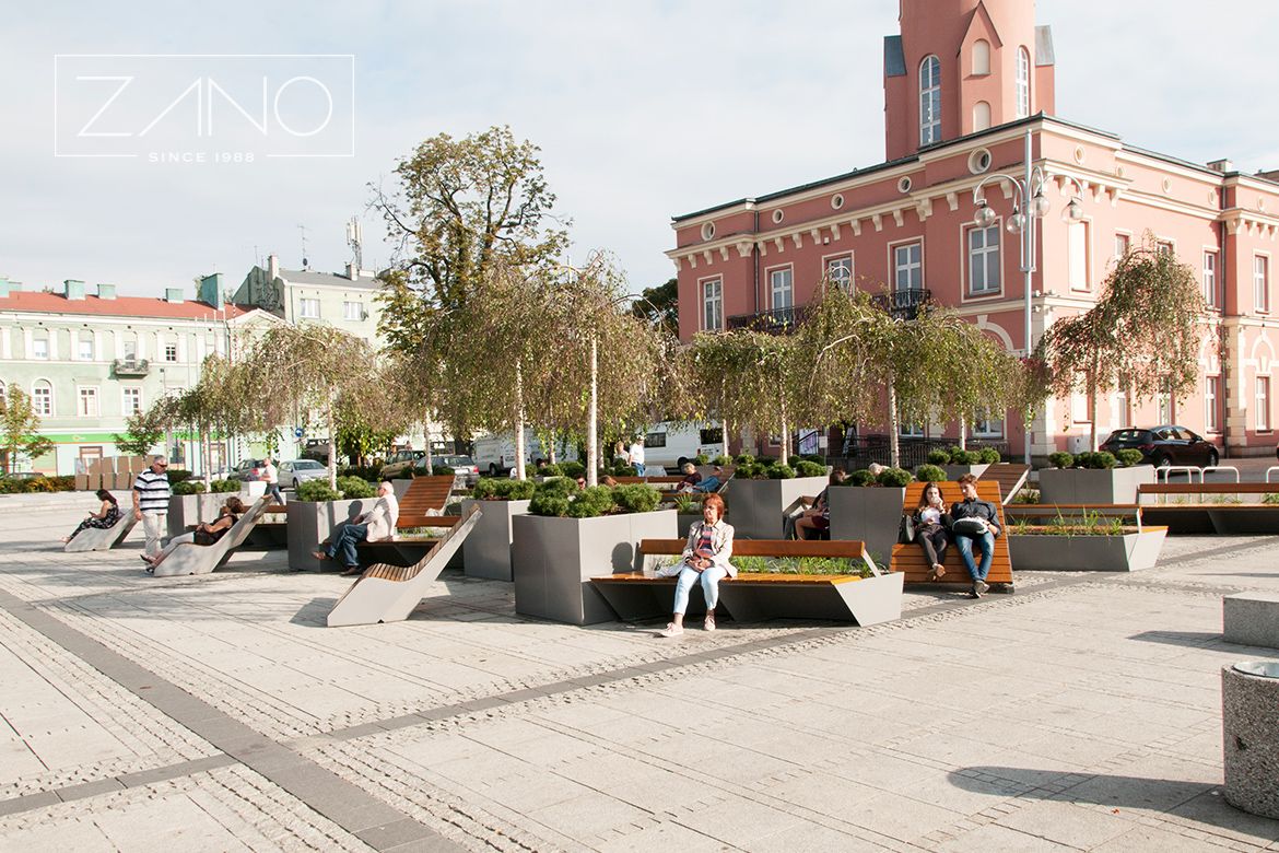 Mai jos sunt fotografii ale băncilor Origami și ale coșurilor de gunoi Pavo, vopsite în 7016 RAL. Lemnul conținut în produse este de molid, lăcuit.