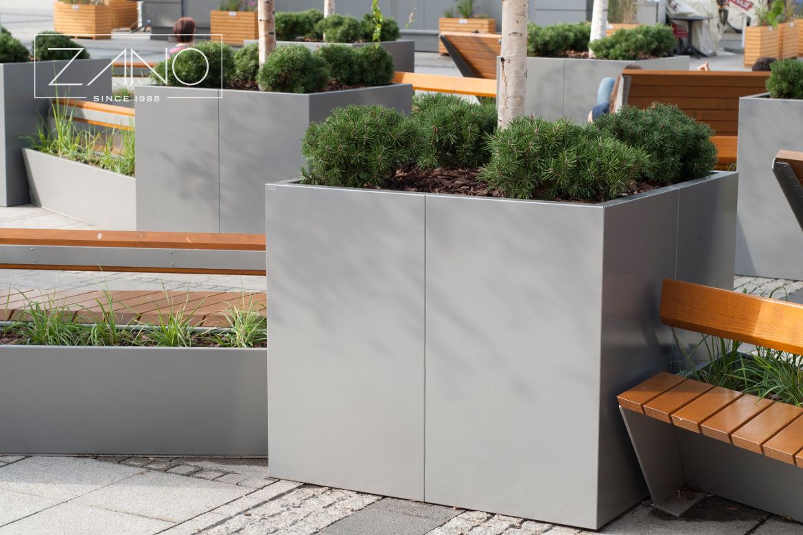 Șezlonguri Duo, bănci Penrose și ghivece de flori Agawa, vopsite în RAL 9007. Lemnul utilizat pentru acest mobilier este lemn de conifere de origine domestică vopsit în culoarea chirpiciului.
