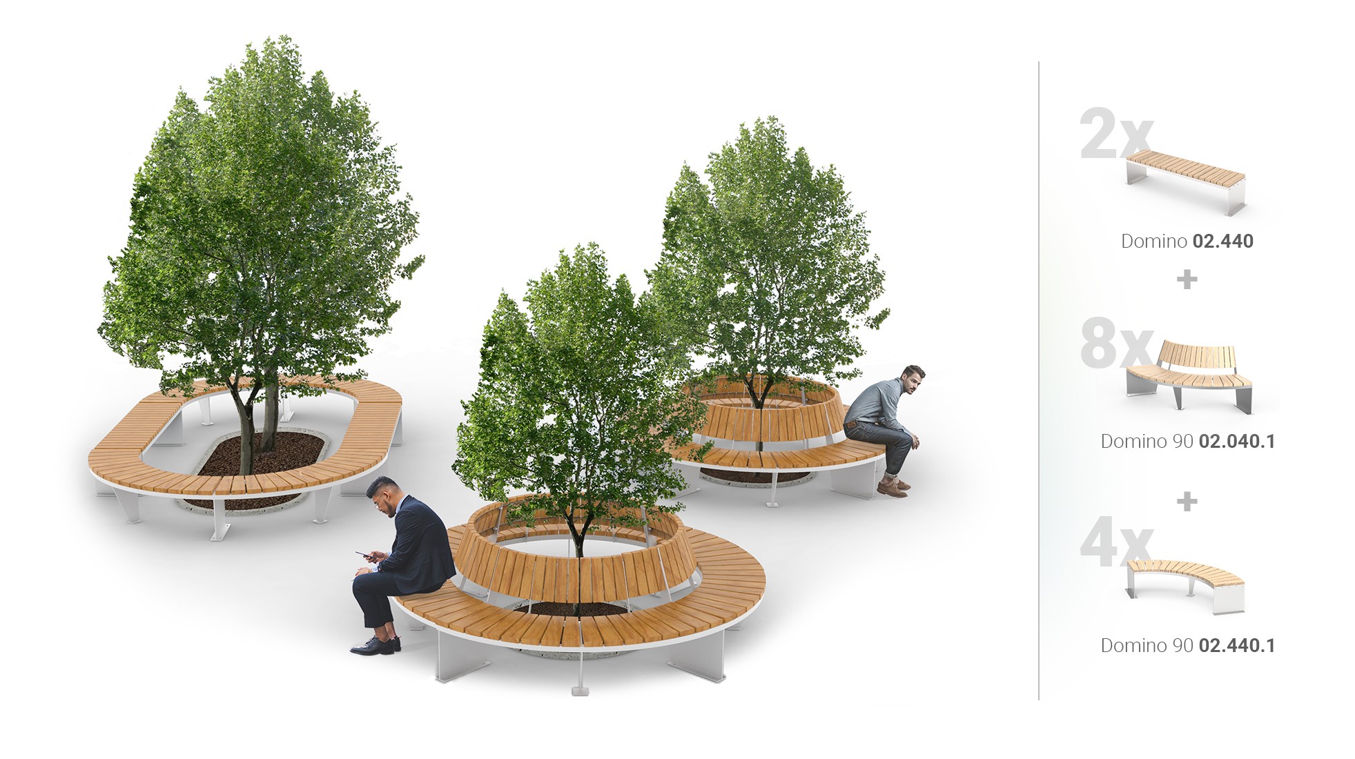 Băncile din seria Domino se combină unele cu altele pentru a forma orice formă și design, oferind un aranjament original pentru orice spațiu public. Banca Domino a fost concepută din oțel inoxidabil și lemn (domestic sau exotic). Utilizarea oțelului inoxidabil în Domino Bench este o garanție a durabilității, precum și a rezistenței la condițiile meteorologice schimbătoare și la deteriorările mecanice asociate cu utilizarea frecventă.