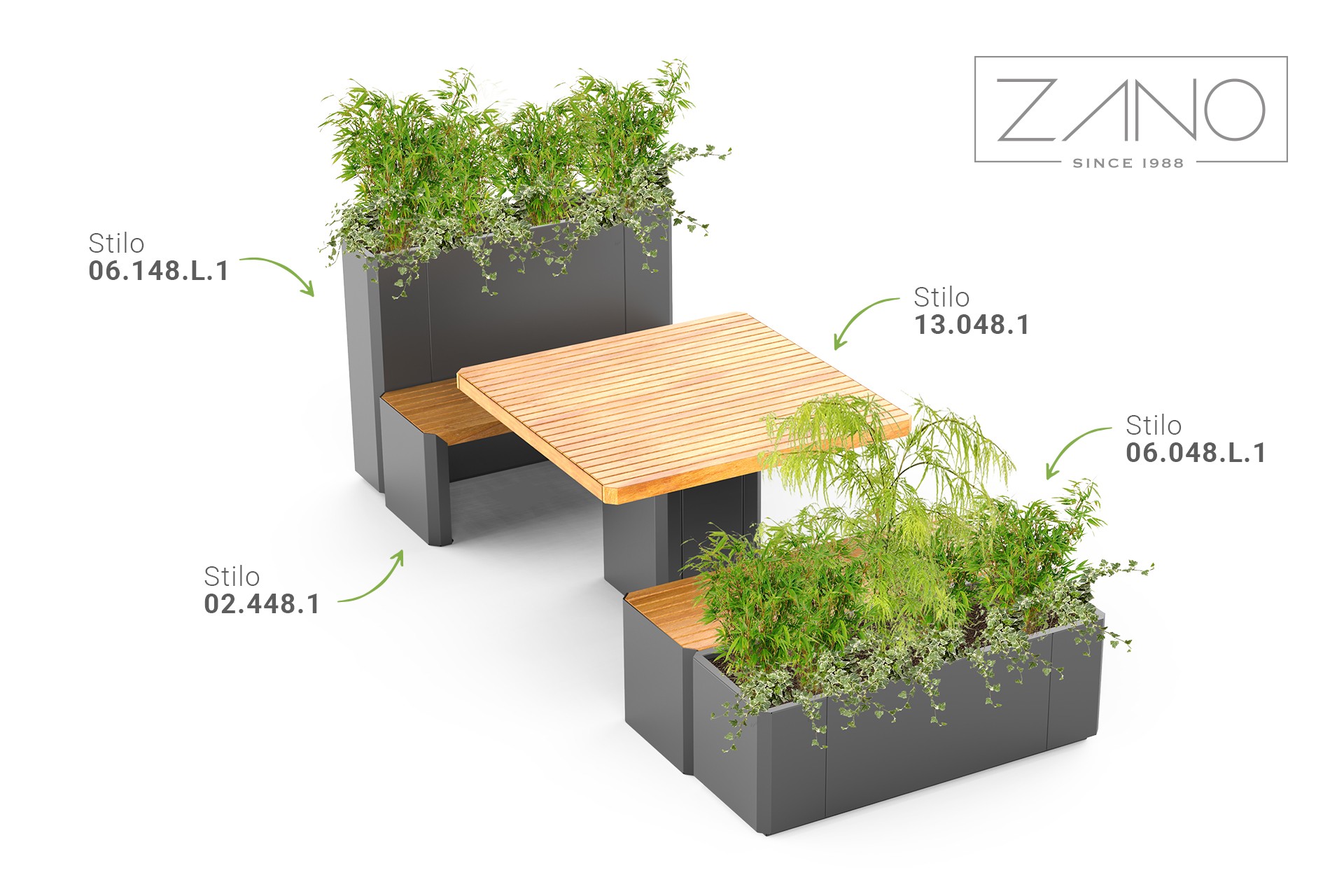 Mai jos sunt câteva exemple de compoziții care utilizează ghivece, bănci și coșuri de gunoi Stilo.