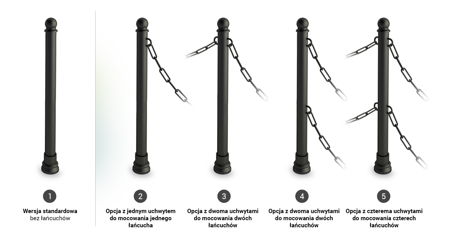 Sunt disponibile la vânzare două tipuri de stâlpi de conectare a lanțului de conectare a străzilor: Lanț clasic Coral și Lanț decorativ Solid. În funcție de nevoile dumneavoastră, există cinci opțiuni pentru configurarea stâlpului cu lanțuri. Opțiunea unu - stâlp fără lan țuri (versiunea implicită), opțiunea doi - stâlp cu unochi pentru lanț, opțiunea trei - stâlp cu două urechi pentru lanț pe ambele părți ale stâlpului, opțiunea patru - stâlp cu atașare dublă a lanțului pe o parte, opțiunea cinci - stâlp cu atașare dublă a lanțului pe ambele părți ale stâlpului. Ilustrația de mai jos prezintă un exemplu de stâlp Bene .