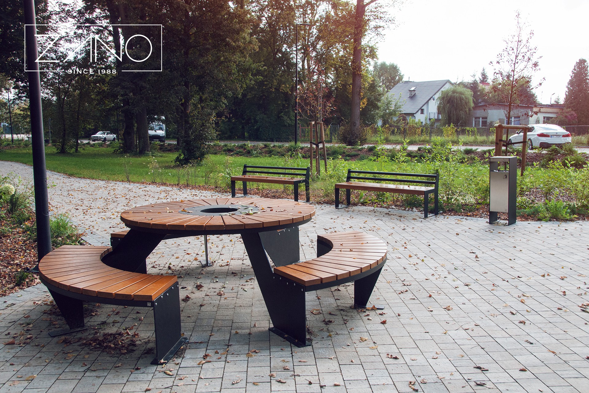 Masa de picnic modernă Domino este o combinație stilistică perfectă cu alte produse din seria Domino. Construcția bazată pe elemente din oțel și lemn creează o combinație armonioasă între designul modern și o masă de picnic tradițională. Datorită formei sale circulare, masa Domino poate găzdui 9 persoane, iar gaura din centrul blatului permite montarea unei umbrele. Masa de picnic Domino este disponibilă în diferite variante. Putem folosi oțel negru (vopsit în orice culoare RAL) sau oțel inoxidabil, iar elementele din lemn sunt realizate din lemn domestic sau exotic. Masa poate funcționa ca o piesă de mobilier independentă sau poate fi fixată la sol cu ajutorul unor șuruburi de expansiune.