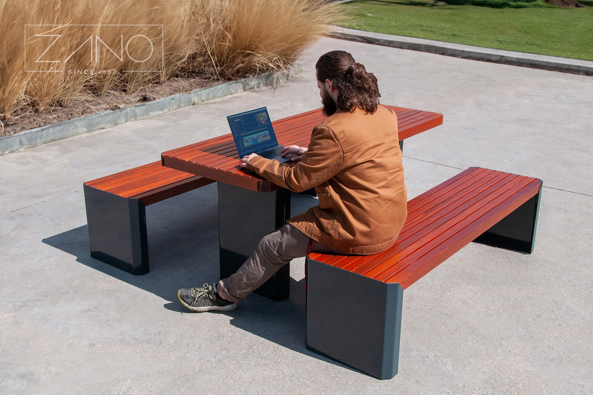 Stilo 13.048 este o masă urbană mare, compatibilă cu băncile din gama Stilo. Produsele pot fi juxtapuse pentru a crea spații de luat masa.
