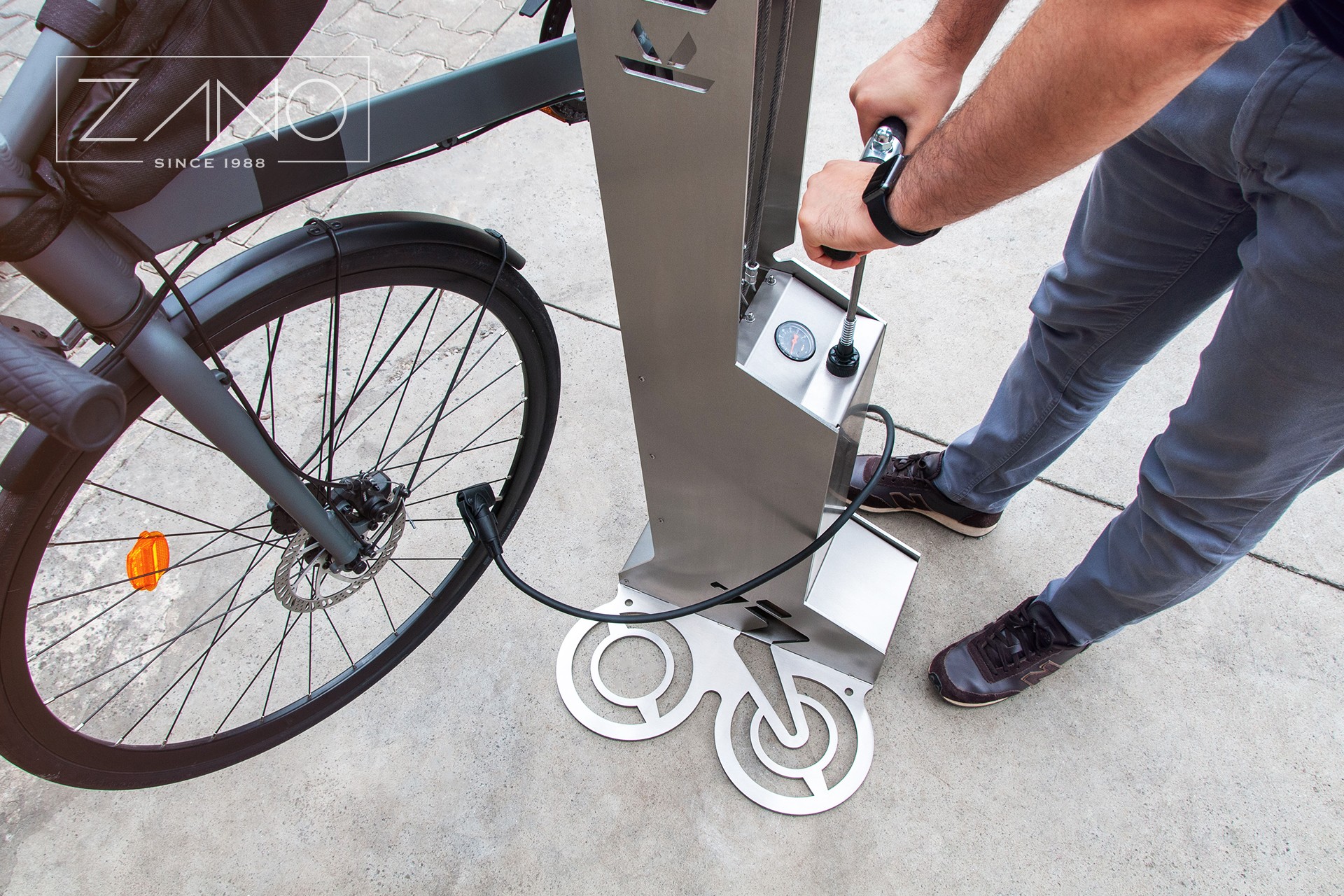 Stație pentru repararea și întreținerea independentă, ad-hoc, a bicicletelor, echipată cu trusă de scule, suport pentru biciclete și pompă de podea cu manometru.