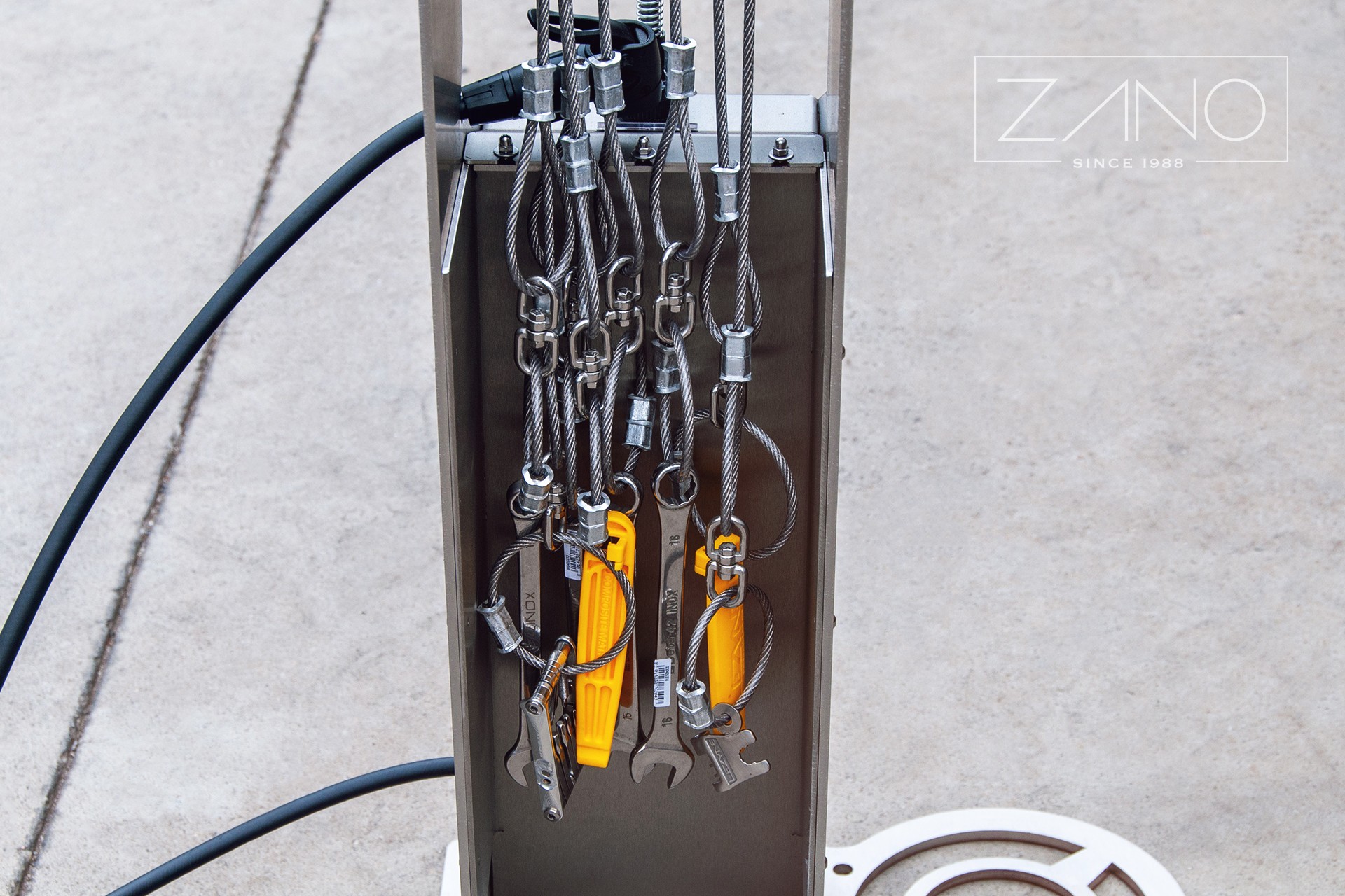 Stația pentru repararea și întreținerea independentă și de urgență a bicicletelor este echipată cu un suport pentru biciclete, un suport pentru biciclete în spate, o pompă de podea cu manometru și o trusă de scule.