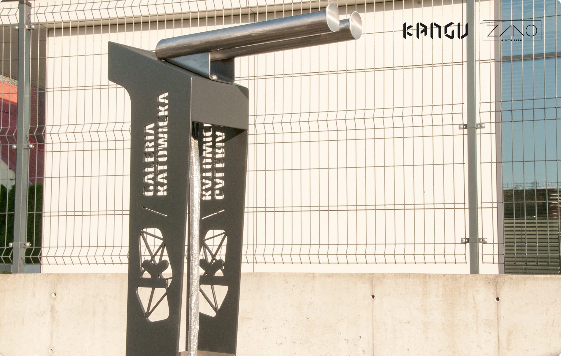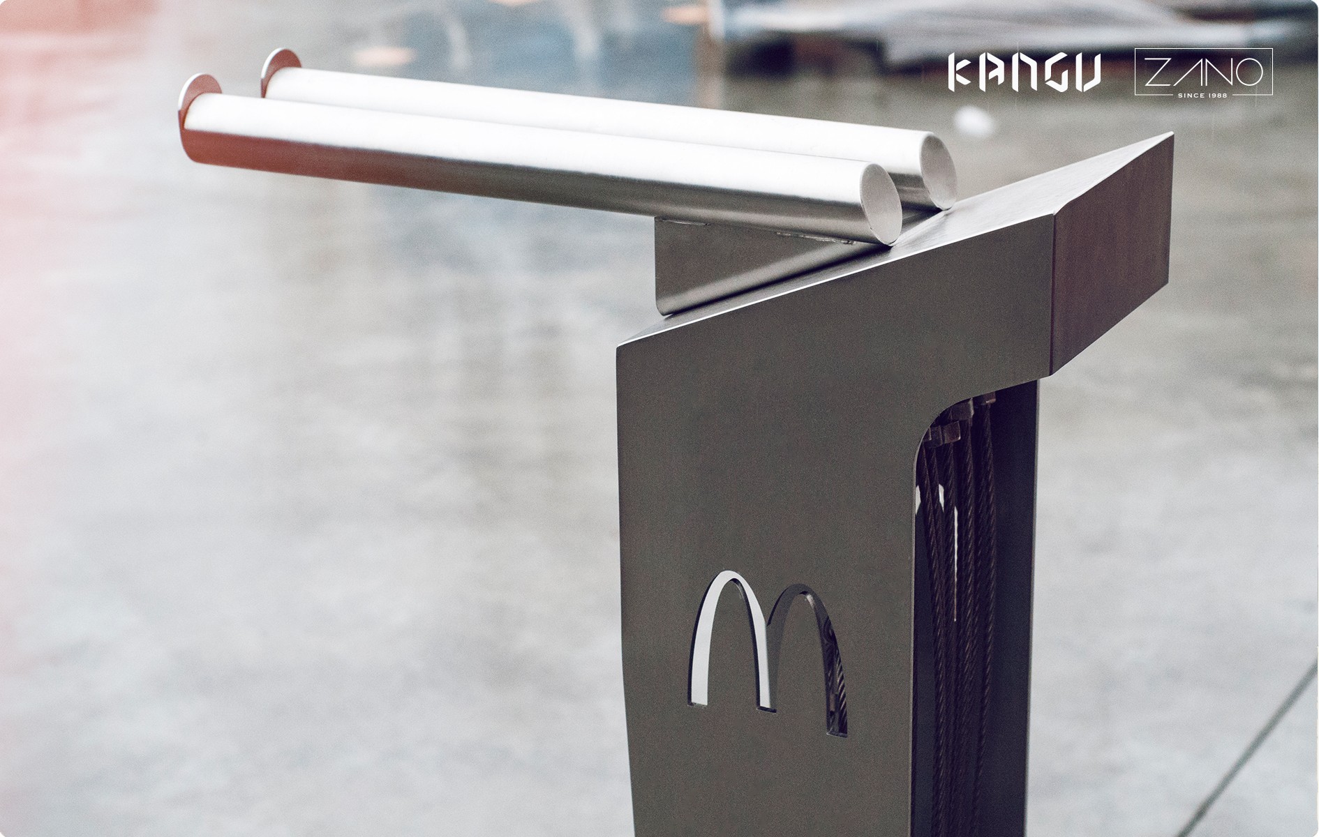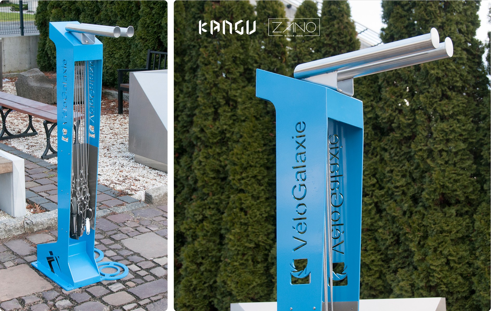 Suportul completează linia de stații pentru biciclete KANGU. Acesta prezintă un motiv distinctiv de biciclist, decupat la baza standului și a fiecărei stații.